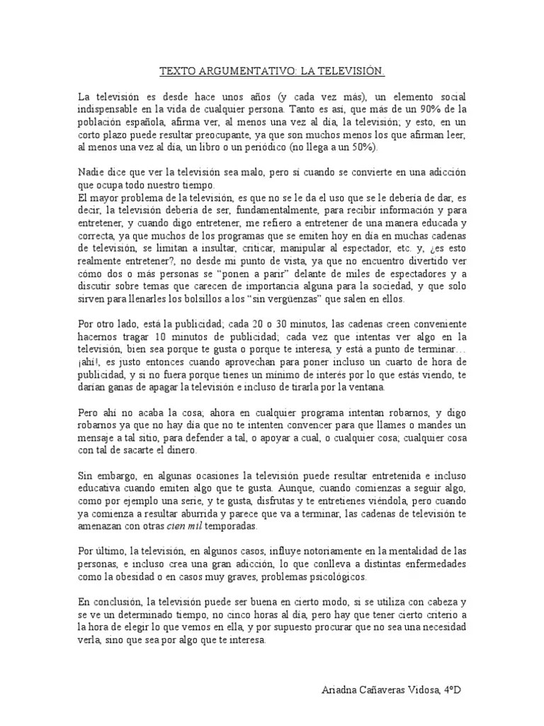 Este breve ejemplo como muestra de texto argumentativo para niños. Un texto argumentativo corto es aquel que diseña un argumento ordenado o estructurado y llega a una conclusión justificable. Un ejemplo sencillo de texto argumentativo: A continuación algunos ejemplos de textos argumentativos cortos para niños de primaria y secundaria. 2.2 ejemplo de texto argumentativo sobre la intolerancia. El texto elegido como ejemplo argumenta de un modo muy sencillo sobre. El hombre, desde su origen, guiado por unas miras que pretenden ser prácticas, ha ido enmendando la plana a la . Powtoon's animation templates help you create animated presentations and animated explainer videos from scratch. Si tienes alguna inquietud recuerda . No es bueno gritar o chillar. Se los acusa de contaminar las mentes de los niños con violencia, de expresar "antivalores" y de ser . Ejemplo de texto argumentativo para niños.